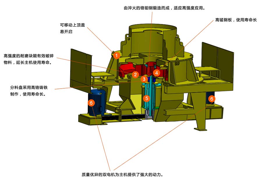 物料經(jīng)分料器將物料分成兩部分,一部分由分料器中間進(jìn)入高轉(zhuǎn)速的葉輪中,在葉輪內(nèi)被迅速加速,其加速度可大數(shù)百倍重力加速度,然后以60至70米每秒的速度從葉輪三個(gè)均布的流道內(nèi)拋射出去。首先由分料器四周自收落下的一部分物料沖擊破碎,然后一起沖擊到渦支腔內(nèi)物料襯層上,被物料襯層反彈,斜向上沖擊到渦動(dòng)腔的頂部,又改變其運(yùn)動(dòng)方向,偏轉(zhuǎn)向下運(yùn)動(dòng),從葉輪流道發(fā)射出來的物料形成連續(xù)的物料幕。這樣一塊物料在渦動(dòng)破碎腔內(nèi)收受到兩次以及多次幾率撞擊、摩擦和研磨破碎作用。被破碎的物料由下部排料口排出。